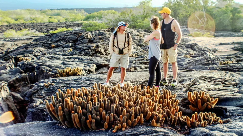 Jour 4 : Matin, promenade de 2,5 kilomètres sur l'île de Plazas (Sud), île minuscule bordée de falaises et recouverte de cactus Opuntia. C’est le lieu de repos de l'une des plus grandes colonies d'otaries des Galápagos, ainsi que d'iguanes terrestres jaunes et rouges. Après-midi, snorkelling avec otaries dans les eaux turquoise de Santa Fe.